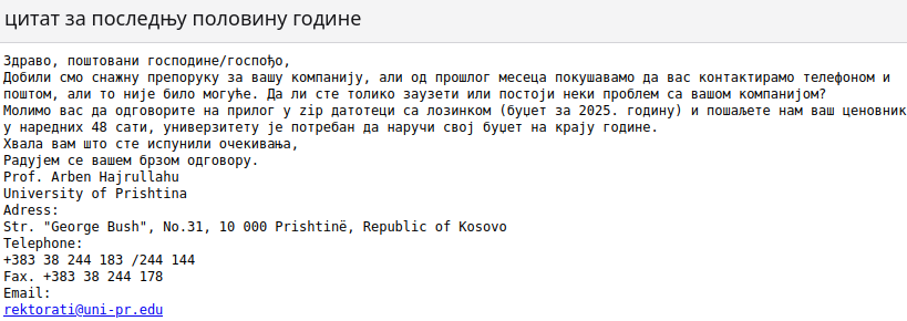 Желимо да вас обавестимо да је у оптицају фишинг мејл који се лажно представља као порука са Универзитета у Приштини, потписана од стране „Prof. Arben Hajrullahu“.