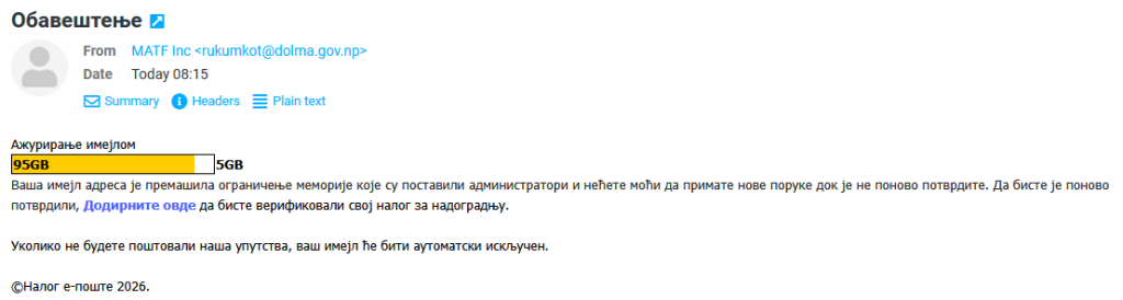 Ограничење меморије које су поставили администратори, никако се не може путем клика верификовати. Може се само избрисати део и тако смањити квота. Што би и било наведено у мејлу да је послат са легитимне адресе са домена matf.bg.ac.rs.